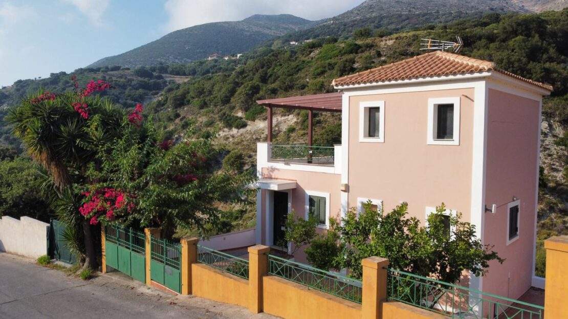 Occupying the top level is a private master bedroom suite, complete with its own en-suite bathroom and access to a spacious terrace that captures panoramic views of the surrounding green hills and the Ionian Sea in the distance.